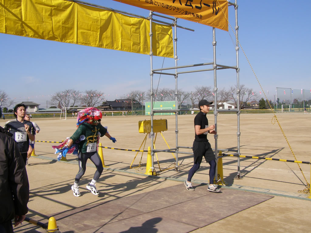 結局記録は、大したことがなかったが、一応、1時間30分を切れたのが収穫だろう。 練習で疲れたままスタートして、これだけやれるのだから、調子が良いのだろう。 あとは、見学。 あ、蜂と、こいのぼりマンが、走っているではないか。 とりあえず、この大会はお勧めです。 手打ちうどんと、トン汁も付いています。 来年も、練習の合間に参加しよう・・・・・・